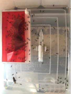 持ち帰り、ウメマツオオアリのサテライトコロニーに寄生させることにしました。すると、最初は戸惑った様子で、ウメマツオオアリのワーカーに興味を示す事はありませんでした。しかし、途中からワーカー達に興味を示すようになり、匂い付けを始めました。トゲアリは小型のオオアリにも寄生することは知っていましたが、匂い付けを今回確認することができました。