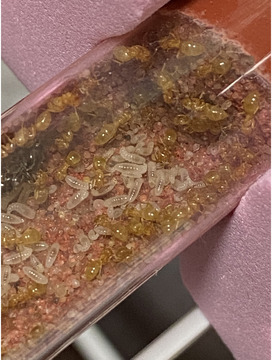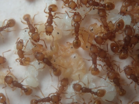 いずれのコロニーでも女王は観察できませんでしたので、幼虫を少し拝借して飼育している同種コロニーに導入しました。