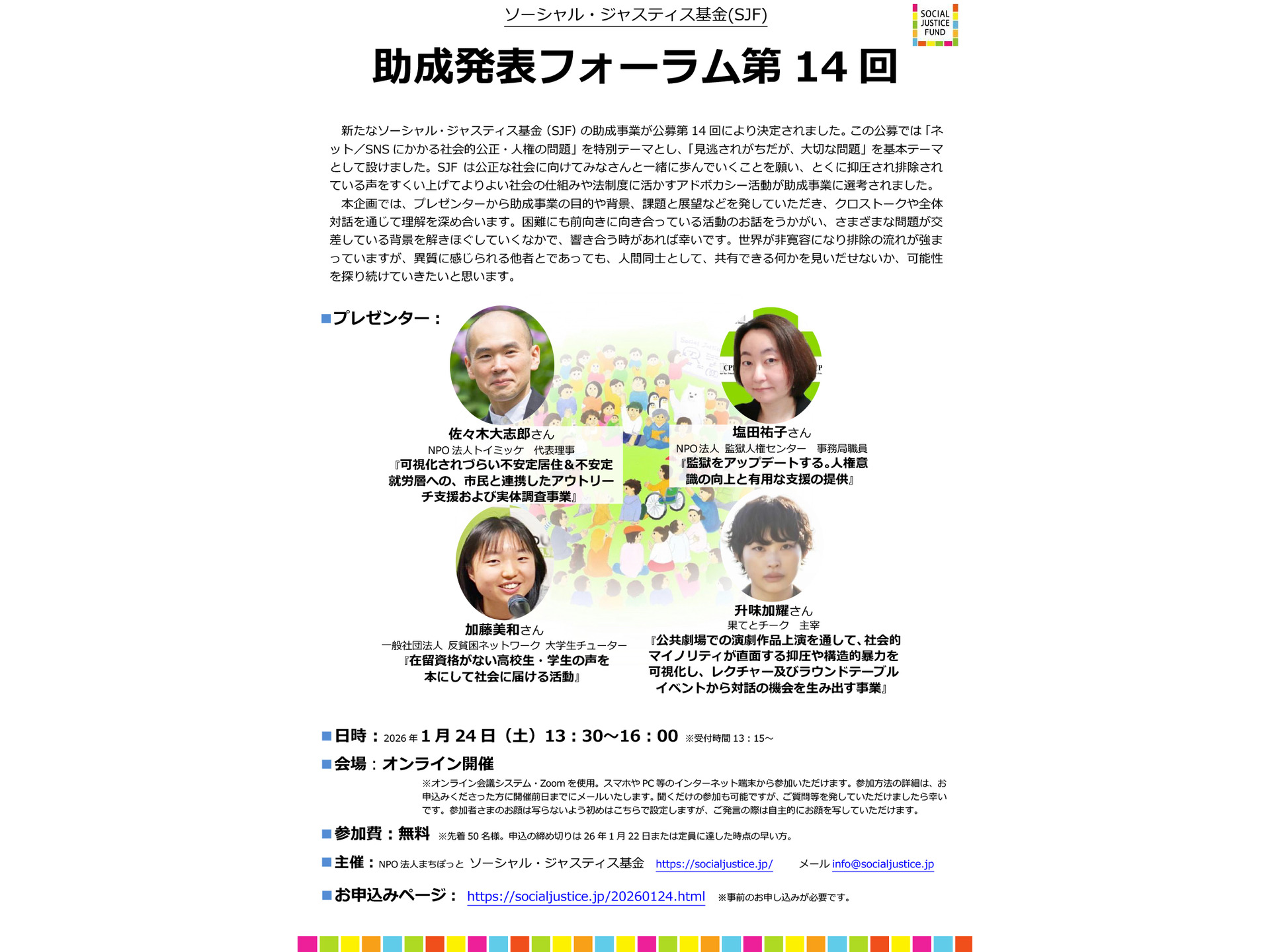 新たなソーシャル・ジャスティス基金(SJF)の助成事業が公募第14回により決定されました。この公募では「ネット/SNSにかかる社会的公正・人権の問題」を特別テーマとし、「見逃されがちだが、大切な問題」を基本テーマとして設けました。SJFは公正な社会に向けてみなさんと一緒に歩んでいくことを願い、とくに抑圧され排除されている声をすくい上げてよりよい社会の仕組みや法制度に活かすアドボカシー活動が助成事業に選考されました。