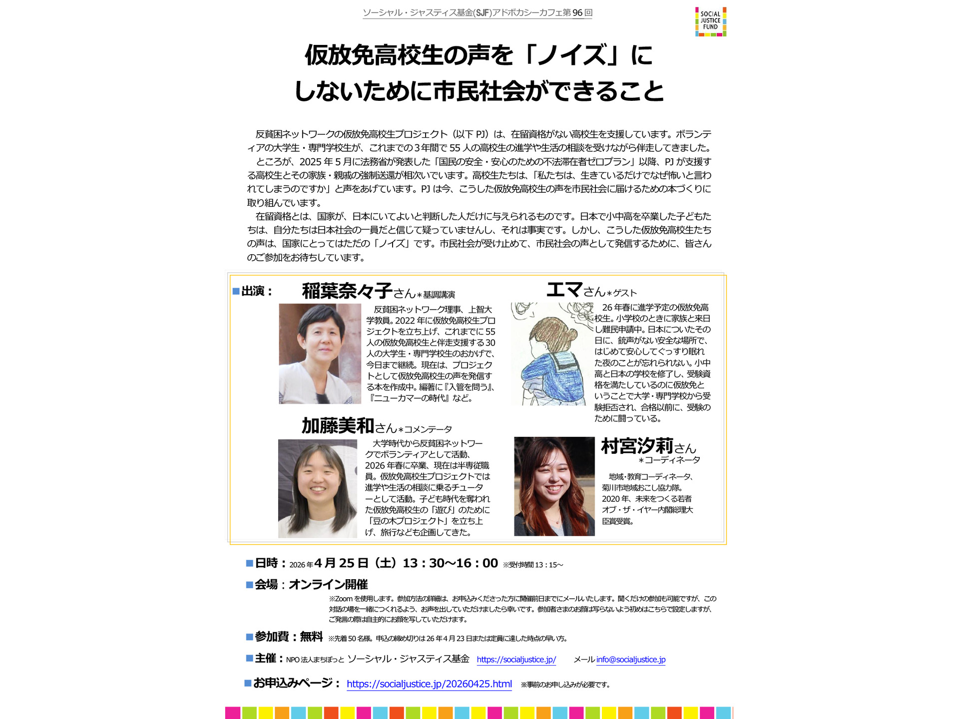 『仮放免高校生の声を「ノイズ」にしないために市民社会ができること』:SJFアドボカシーカフェ第96回