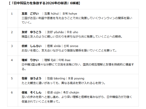 ✔「日中韓協力を象徴する2026年の単語」発表:1月1日(水)