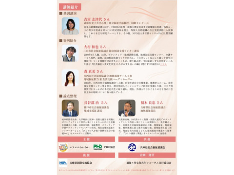本フォーラムでは、「支援から参加、活躍へ」をキーワードに、多文化共生社会における福祉の役割および、福祉分野と多文化共生分野との連携について考えます。