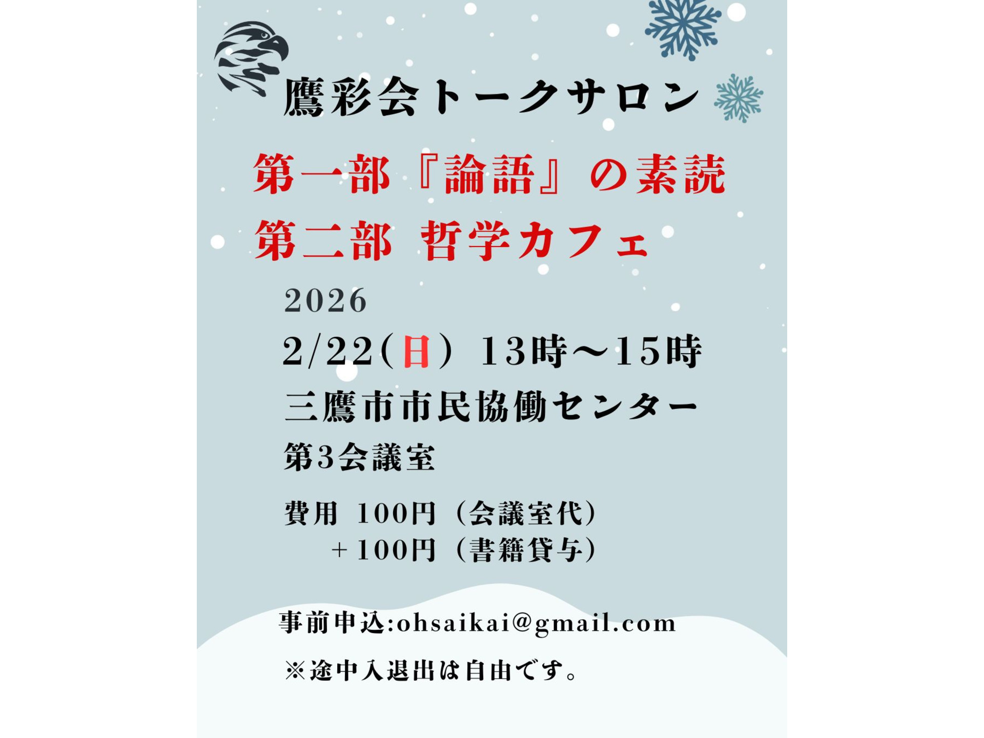 2/22(日)トークサロン「『論語』の素読」「哲学カフェ」(鷹彩会(おうさいかい)主催)