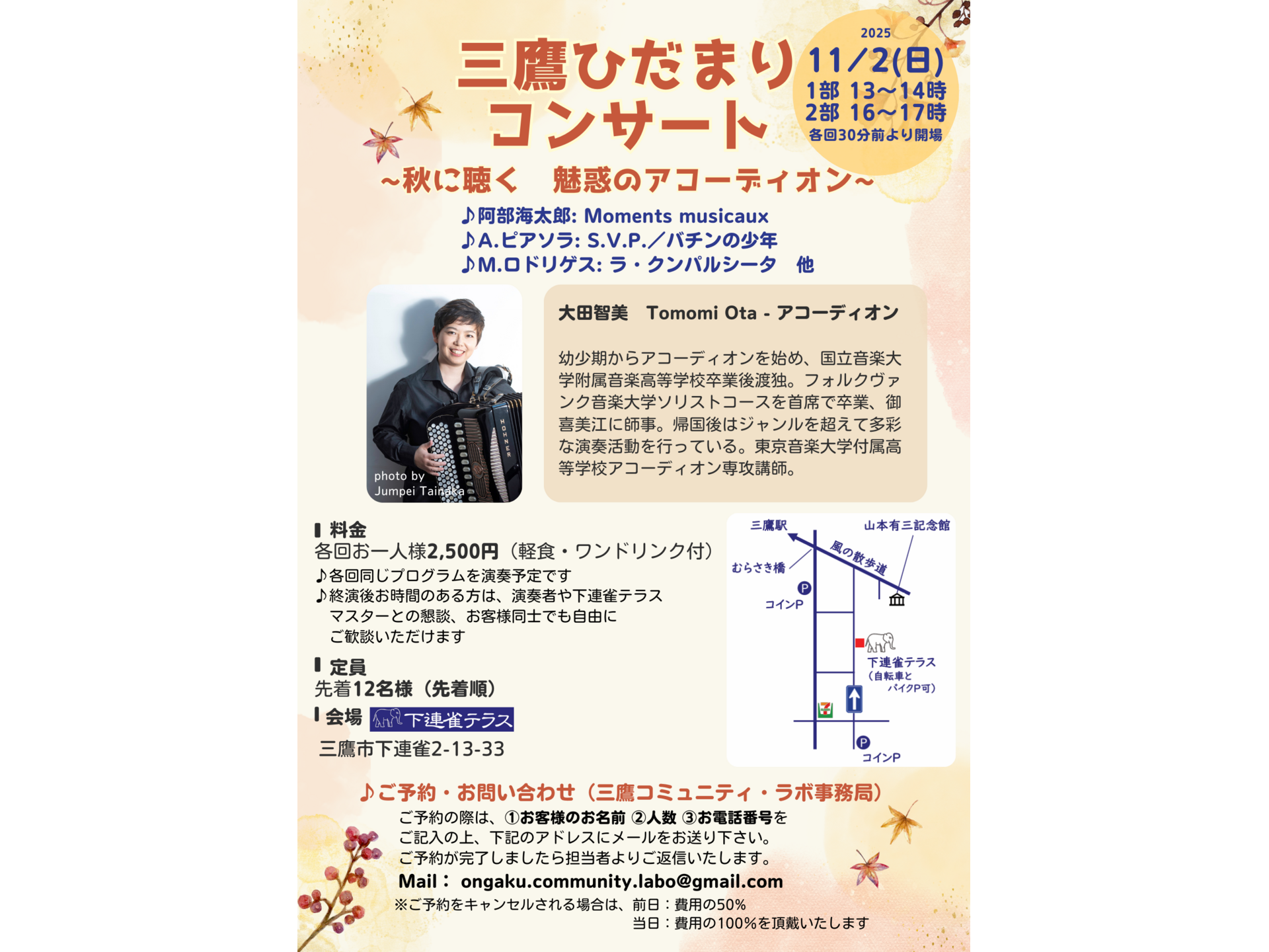 2025年11月2日(日)13時~/16時~ 三鷹ひだまりコンサート ~秋に聴く 魅惑のアコーディオン~