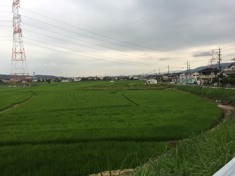 わが町の田園風景です。夕日に照らされ輝く均等な長さの稲が美しいです