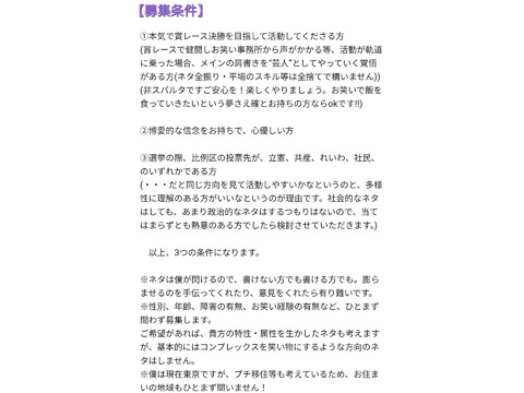 字数の制約上、以下ではやりたいお笑いに絞って書いております。上記画像(タップで鮮明に見られます)の【自己紹介】/【募集条件(※)】/【活動について】も参考になさってください。